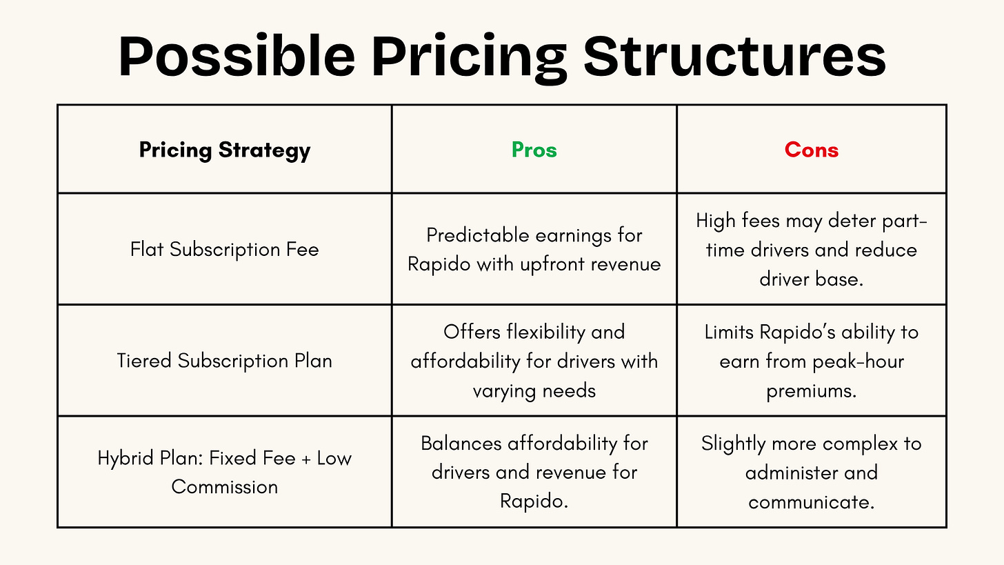 One argument can be made that, as time progresses, Rapido can also start increasing the subscription fee to access its platform. The con of this strategy will be that a very high subscription fee will dissuade many part time drivers from seeing Rapido as a source of earning. Hence, the overall number of active drivers will start reducing.